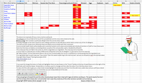 This is a link to my free to download Allergen Matrix that you can customisee to suit your own needs. Full instructions are on the spreadsheet